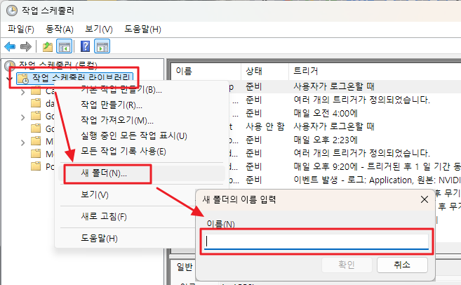 '작업 스케줄러 라이브러리' 선택, 하위메뉴(마우스 우 클릭, 혹은 Option 메뉴 버턴) 선택, '새 폴더...' 선택