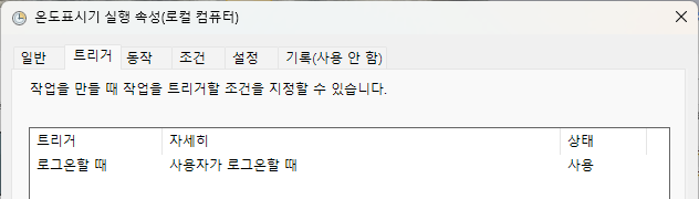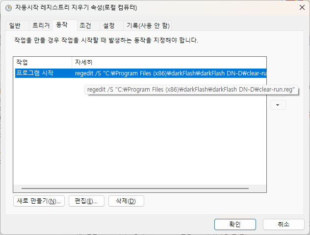 - 추가 트리거: 사용자가 로그온 할 때 - 트리거 된 후 15분 후, 자동실행 레지스트리 항목 삭제 실행 등록
