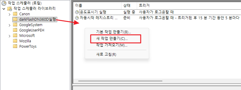 - '작업 스케줄러'를 통해 ' 트리거: 사용자가 로그온 할 때, 프로그램 실행: darkFlash DN-D.exe ' 실행 등록