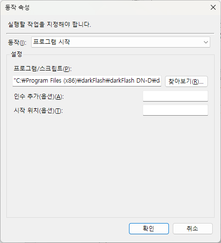 동작: 실행할 대상 - 여기서는 darkFlash 프로그램을 지정하면 됩니다.