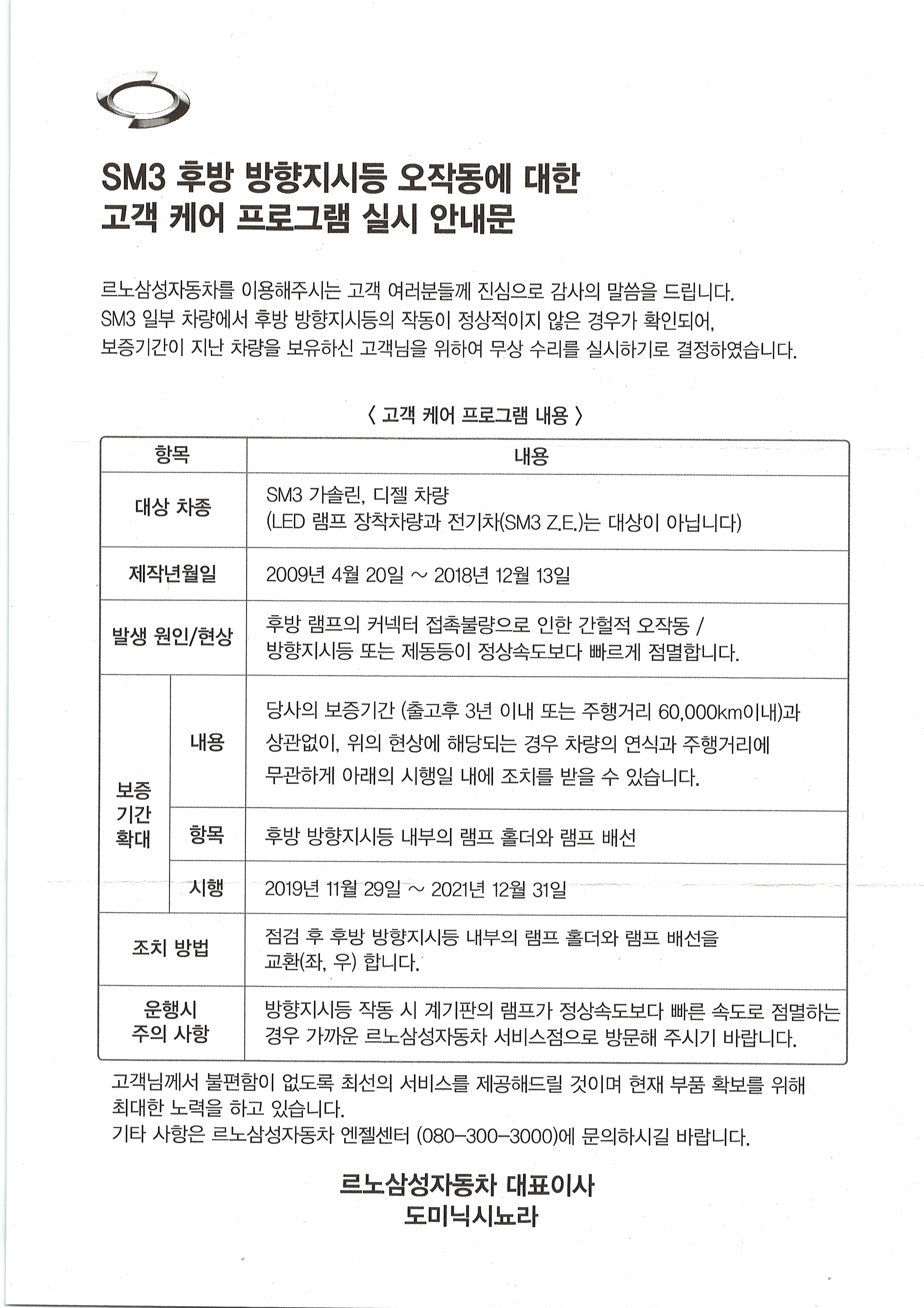 | 대상 차종 | SM3 가솔린, 디젤 차량 (LED 램프 장착차량과 전기차(SM3 Z.E.)는 대상이 아닙 니다 |