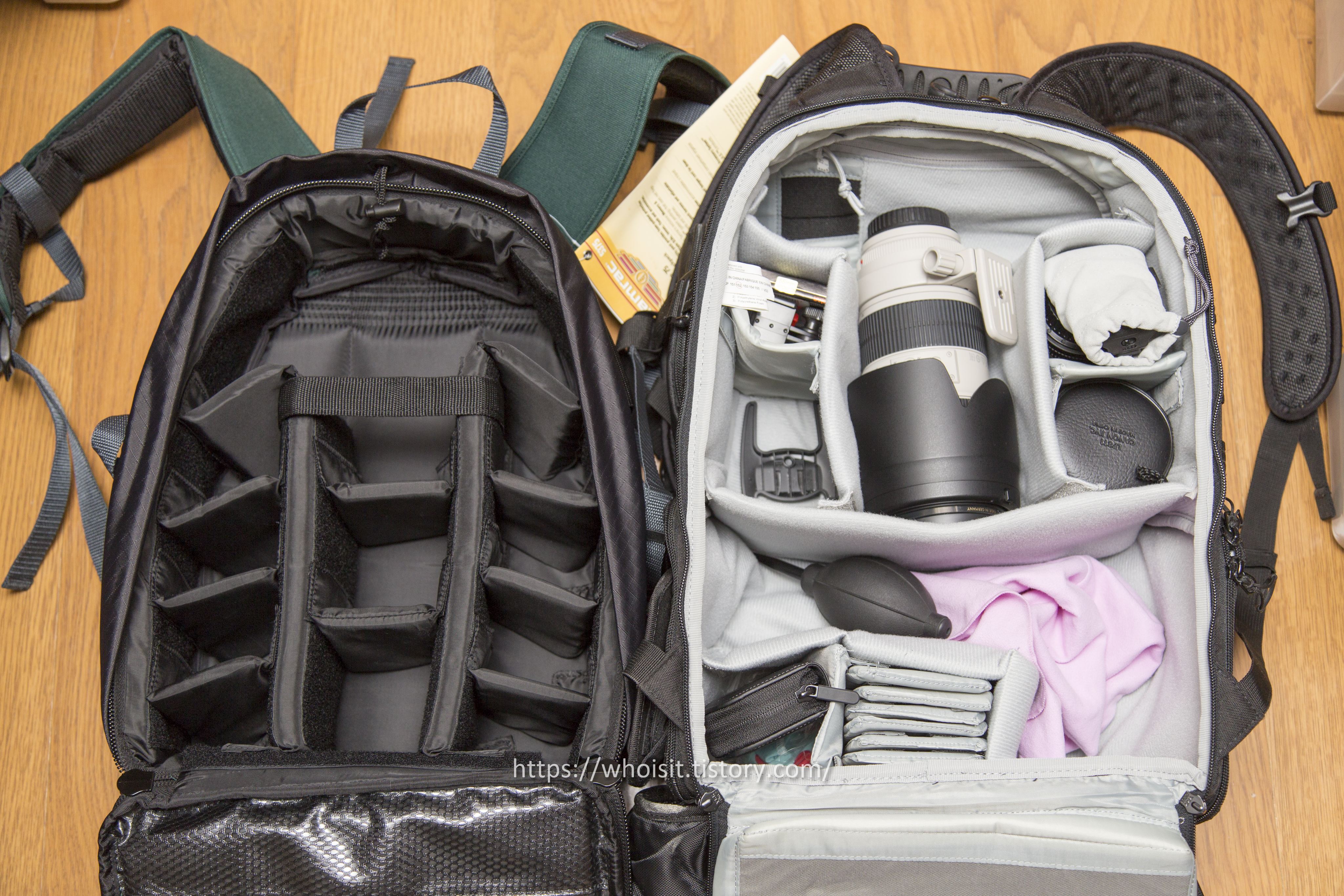 마운트 한 상태로 1대의 DSLR 셋과 추가 렌즈와 액세서리를 담을 수 있고, ProTactic 450AW 보다는 상대적으로 작은 편입니다.