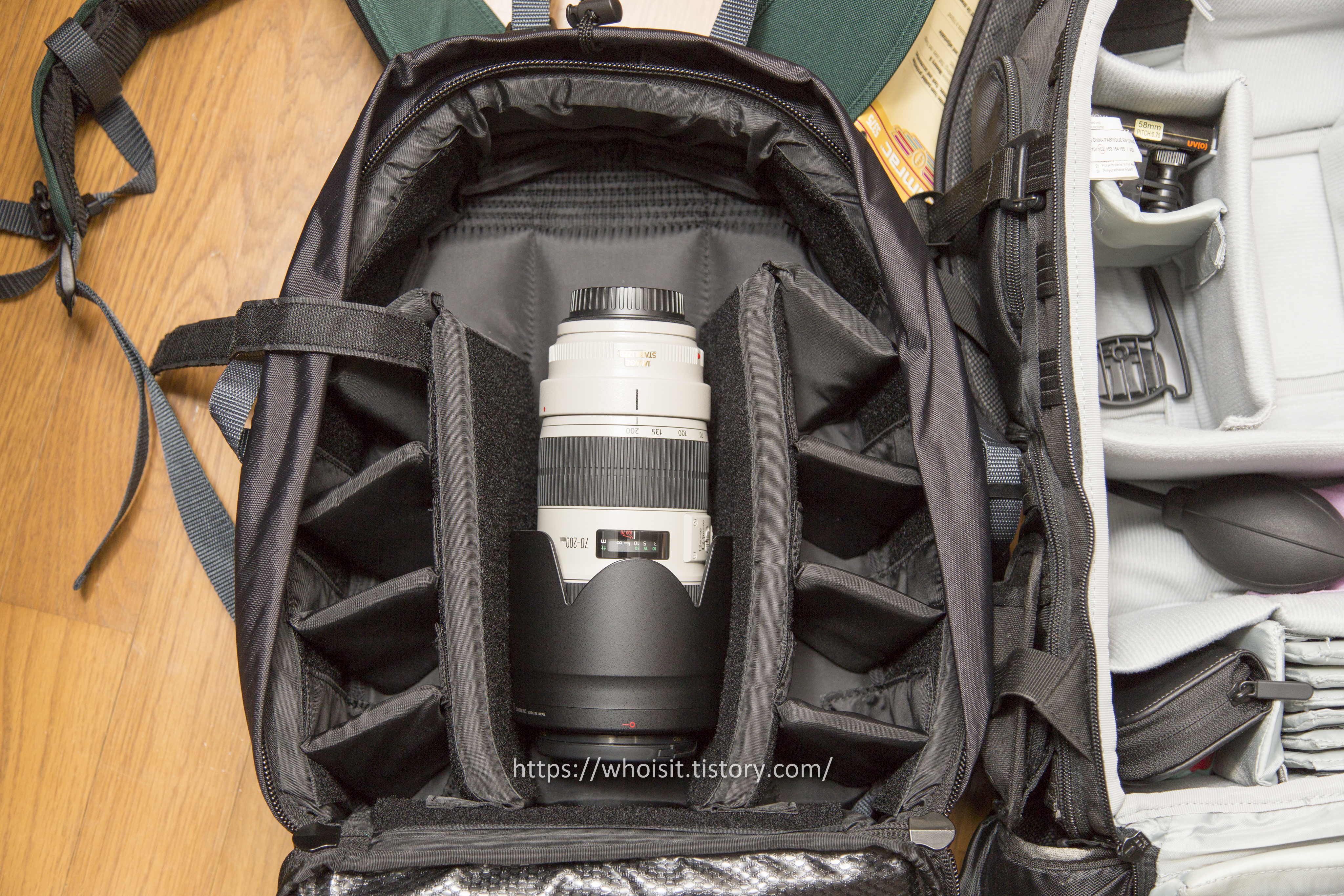 마운트 한 70-200 F2.8 한대, 스트로브, 추가 렌즈 2개 정도 용량을 제공.