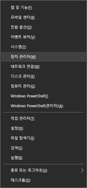 1. Window key + X 누르고, 장치 관리자를 선택
