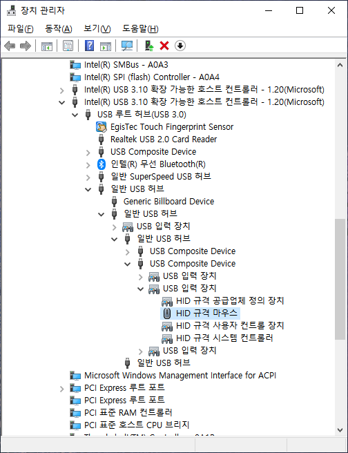 2. 장치 관리자 - 버벅거리고 있는 마우스 선택 (그런데 어느 마우스? 아래 3에서 확인)