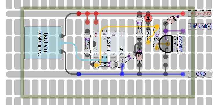 15.2V 에서 relay를 동작시키게 2N2222 TR을 활성화하고, 약 7V 동작이 되어 relay로 과 전류도 자연스럽게 해결됨! (실 동작은 15.3V가 되게 반고정 저항 1M 사용)