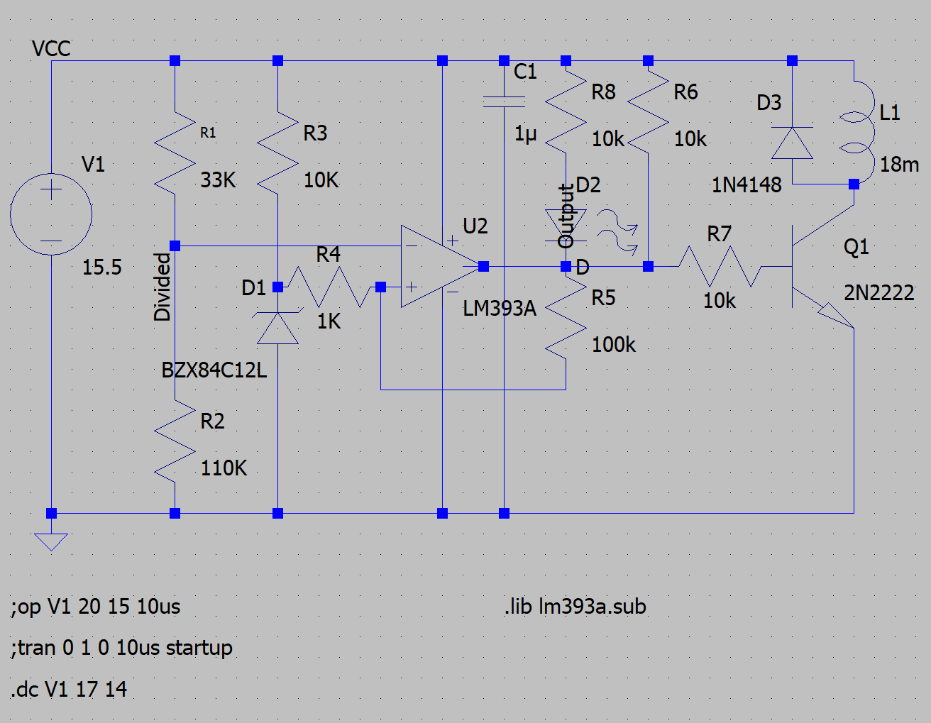 처음 LM393으로 회로 구성을 하려니 전압 divide 처리와, 실제 동작 회로에 자신이 없어(전자공학 전공 아님) 결국 simulator까지 사용하게 되었습니다. 처음 익히기는 어려운데(LT Spice가 공짜라서 현대식 돈 주고 쓰는 web tool과는...) 그래도 배워서 사용했습니다. 아래처럼 회로를 구성했습니다.