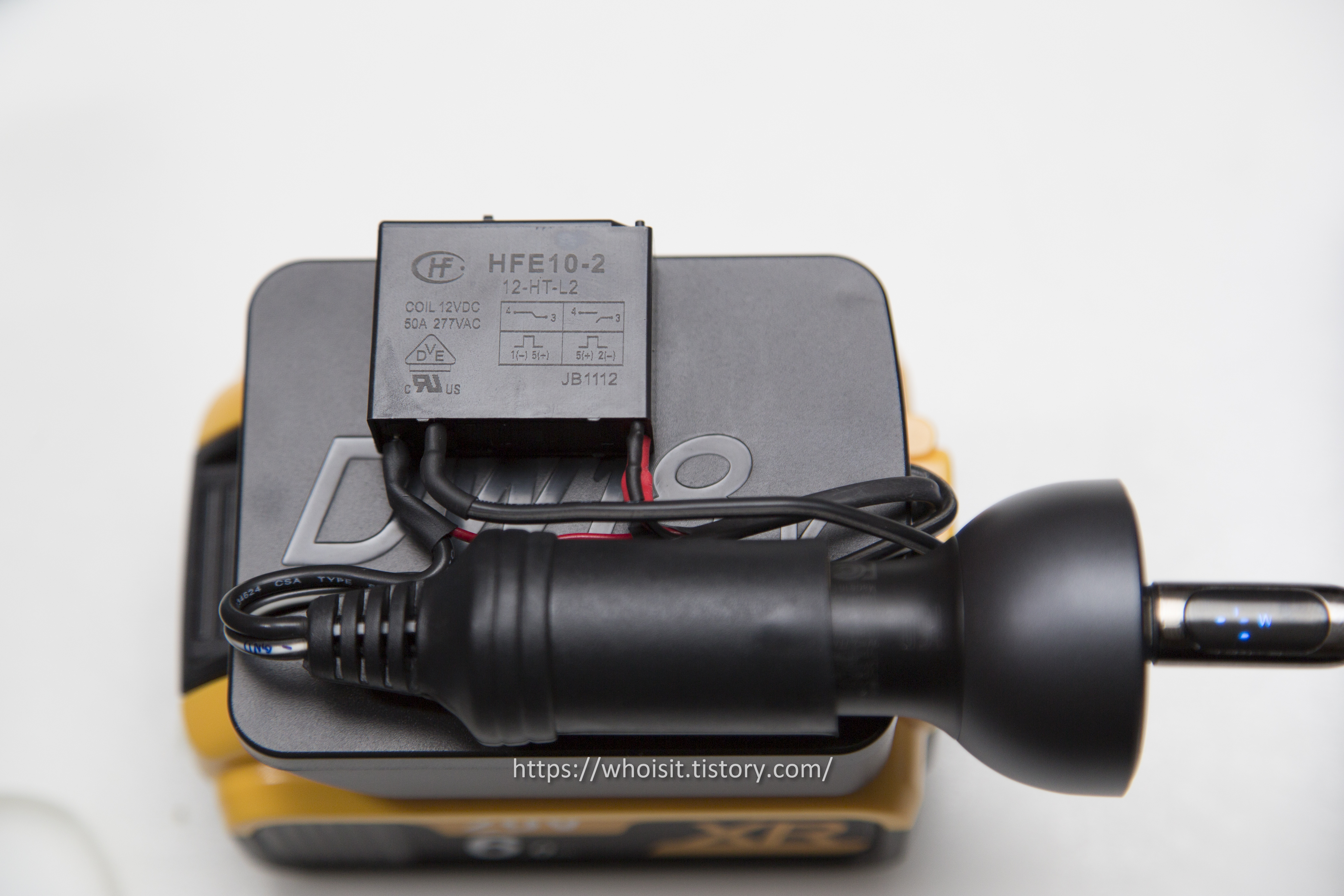 시거짹용 소켓, Latching relay는 한 덩치 하기에 아래 그림처럼 배터리 어댑터 위쪽면에 강력 양면 테이프로 부착을 합니다. 아! 부착 전에 전원선을 잘 연결합니다. 대용량(15A)을 감당할 수 있는 굵은 선을 사용하세요!