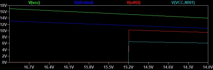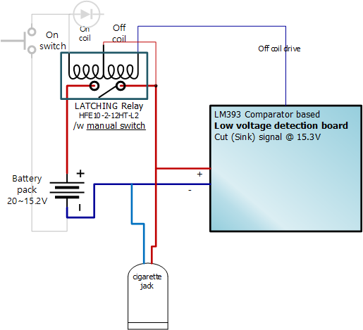 그래서 15.3V 기준으로 전원을 끊어 주어야 하는 회로가 필요합니다. 보통 Op-Amp를 이용하고 이러한 부품이 완성 부품으로 구매가 가능합니다. "LM393 relay"로 검색하면 기성품으로 구매 가능 합니다.