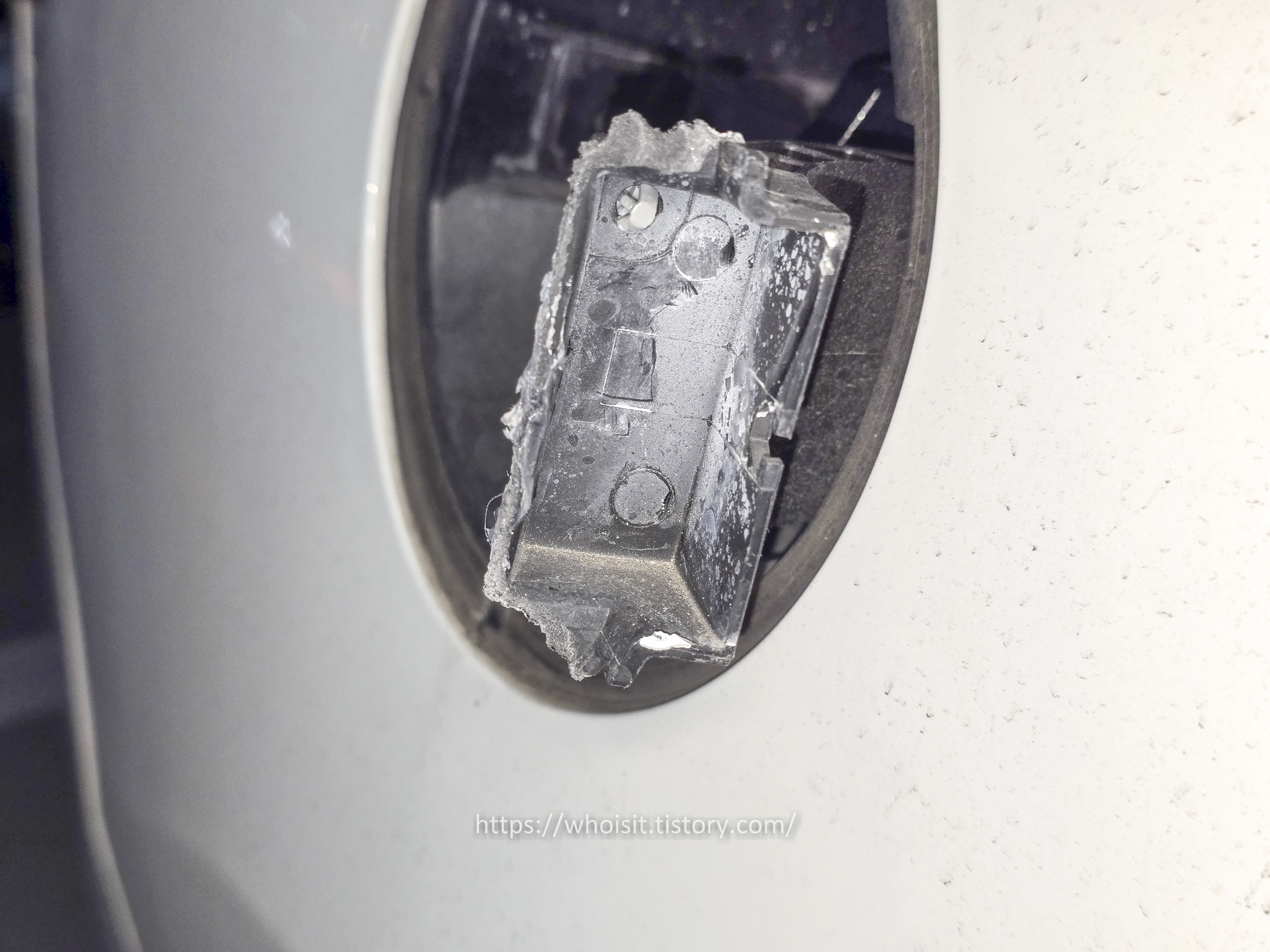 앞서 입은 충격에 더해 - 주유 뚜껑과 연결되는 꺾임 부분이 90% 가까이 부러져 버렸습니다